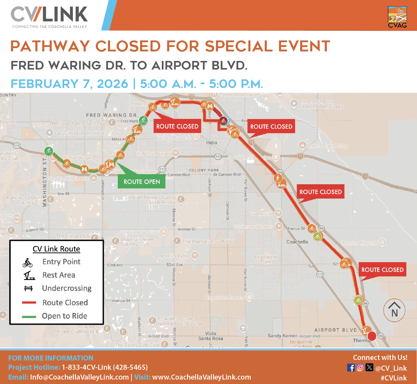 The CV Link pathway will be temporarily closed to the public on February 7, 2026 from 5:00 a.m. to 5:00 p.m. from Fred Waring Dr. to Airport Blvd. for the Tour de Palm Springs. Event staff will be on site to provide traffic control.