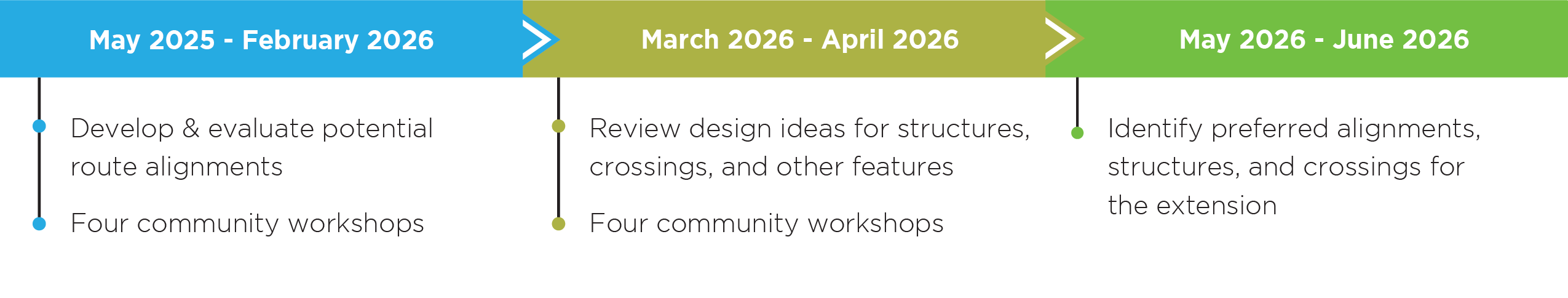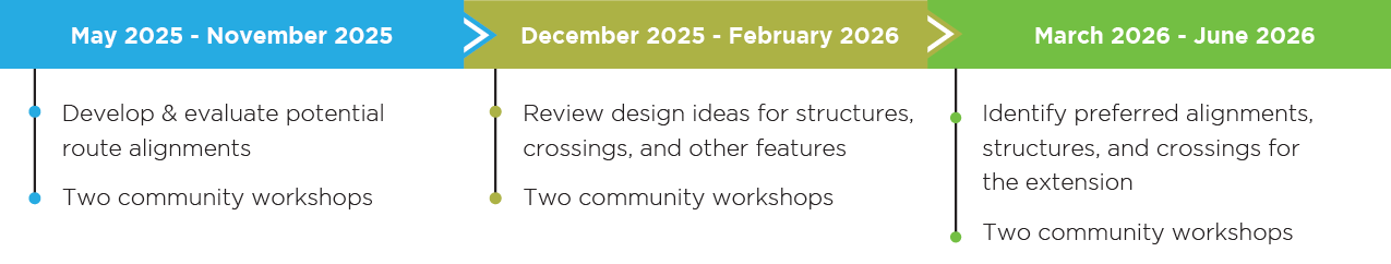 • Two community surveys to gather feedback on alignments, structures, and crossing alternatives